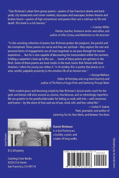 "Dan Richman's urban farm grows poems--poems of San Francisco streets and backyards, city restaurants and corner markets, skyscapes and seascapes, broken dreams and broken hearts--poems of high romanticism and poems that cast a cold eye on life and death. This book is a rich harvest." Carolyn Miller, Painter, teacher, freelance writer and editor and author of After Cocteau and Meditations on the Ascension