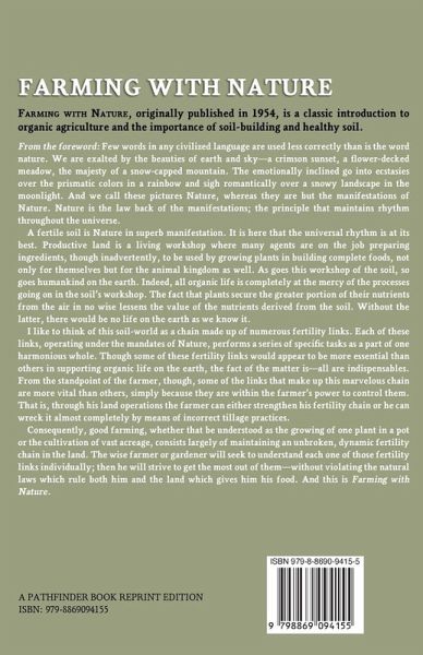 Farming with Nature, originally published in 1954, is a classic introduction to organic agriculture and the importance of soil-building and healthy soil. From the foreword: Few words in any civilized language are used less correctly than is the word nature. We are exalted by the beauties of earth and sky-a crimson sunset, a flower-decked meadow, the majesty of a snow-capped mountain. The emotionally inclined go into ecstasies over the prismatic colors in a rainbow and sigh romantically over a snowy landscape in the moonlight. And we call these pictures Nature, whereas they are but the manifestations of Nature. Nature is the law back of the manifestations; the principle that maintains rhythm throughout the universe. A fertile soil is Nature in superb manifestation. It is here that the universal rhythm is at its best. Productive land is a living workshop where many agents are on the job preparing ingredients, though inadvertently, to be used by growing plants in building complete foods, not only for themselves but for the animal kingdom as well. As goes this workshop of the soil, so goes humankind on the earth. Indeed, all organic life is completely at the mercy of the processes going on in the soil's workshop. The fact that plants secure the greater portion of their nutrients from the air in no wise lessens the value of the nutrients derived from the soil. Without the latter, there would be no life on the earth as we know it. I like to think of this soil-world as a chain made up of numerous fertility links. Each of these links, operating under the mandates of Nature, performs a series of specific tasks as a part of one harmonious whole. Though some of these fertility links would appear to be more essential than others in supporting organic life on the earth, the fact of the matter is-all are indispensables. From the standpoint of the farmer, though, some of the links that make up this marvelous chain are more vital than others, simply because they are within the farmer's power to control them. That is, through his land operations the farmer can either strengthen his fertility chain or he can wreck it almost completely by means of incorrect tillage practices. Consequently, good farming, whether that be understood as the growing of one plant in a pot or the cultivation of vast acreage, consists largely of maintaining an unbroken, dynamic fertility chain in the land. The wise farmer or gardener will seek to understand each one of those fertility links individually; then he will strive to get the most out of them-without violating the natural laws which rule both him and the land which gives him his food. And this is Farming with Nature.