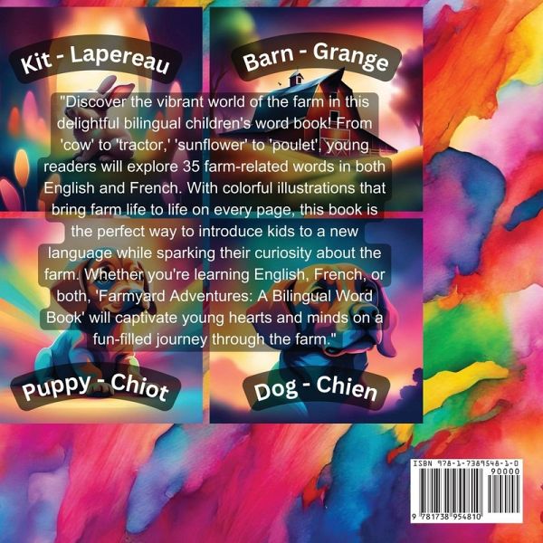 " Discover the vibrant world of the farm in this delightful bilingual children's word book! From 'cow' to 'tractor', 'sunflower' to 'poulet', young readers will explore 35 farm-related words in both English and French. With colorful illustrations that bring farm life to life on every page, this book is the perfect way to introduce kids to a new language while sparking their curiosity about the farm. whether you're learning English, French, or both, 'farmyard Adventures: A bilingual word book' will captivate young hearts and minds on a fun-filled journey through the farm."