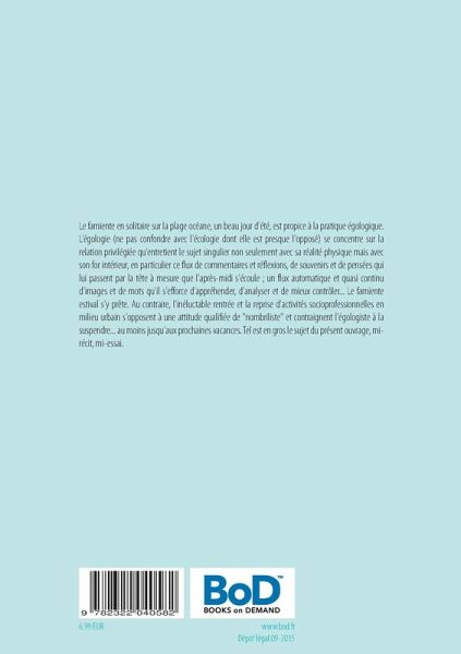 Le farniente en solitaire sur la plage océane, un beau jour d'été, est propice à la pratique égologique. L'égologie (ne pas confondre avec l'écologie dont elle est presque l'opposé) se concentre sur la relation privilégiée qu'entretient le sujet singulier non seulement avec sa réalité physique mais avec son for intérieur, en particulier ce flux de commentaires et réflexions, de souvenirs et de pensées qui lui passent par la tête à mesure que l'après-midi s'écoule ; un flux automatique et quasi continu d'images et de mots qu'il s'efforce d'appréhender, d'analyser et de mieux contrôler... Le farniente estival s'y prête. Au contraire, l'inéluctable rentrée et la reprise d'activités socioprofessionnelles en milieu urbain s'opposent à une attitude qualifiée de "nombriliste" et contraignent l'égologiste à la suspendre... au moins jusqu'aux prochaines vacances. Tel est en gros le sujet du présent ouvrage, mi-récit, mi-essai.