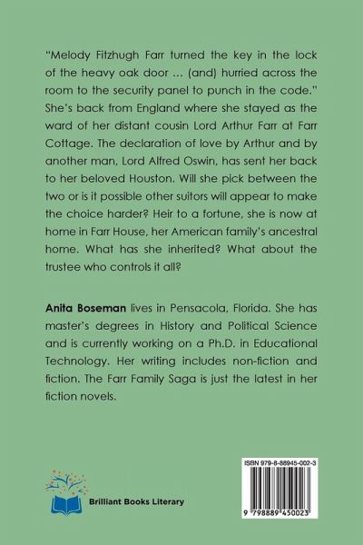 "Melody Fitzhugh Farr turned the key in the lock of the heavy oak door ... (and) hurried across the room to the security panel to punch in the code." She's back from England where she stayed as the ward of her distant cousin Lord Arthur Farr at Farr Cottage. The declaration of love by Arthur and by another man, Lord Alfred Oswin, has sent her back to her beloved Houston. Will she pick between the two or is it possible other suitors will appear to make the choice harder? Heir to a fortune, she is now at home in Farr House, her American family's ancestral home. What has she inherited? What about the trustee who controls it all?