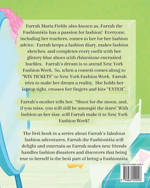 Farrah Maria Fields also know as, Farrah the Fashionista has a passion for fashion! Everyone including her teachers, comes to her for fashion advice. Farrah keeps a fashion diary, makes fashion sketches, and completes every outfit with her glittery blue shoes with the rhinestone encrusted buckles. Farrah's dream is to attend New York Fashion Week. So, when a contest comes along to "WIN TICKETS" to New York Fashion Week. Farrah tries to make her dream a reality. She holds her laptop tight, crosses her fingers and hits "ENTER". Farrah's mother tells her, "Shoot for the moon and if you miss, you will still be amongst the stars!" With fashion as her star, will Farrah make it to New York Fashion Week? The first book in a series about Farrah's fabulous fashion adventures. Farrah the Fashionista will delight and entertain as Farrah makes new friends, handles fashion disasters and discovers that being true to herself is the best part of being a Fashionista.
