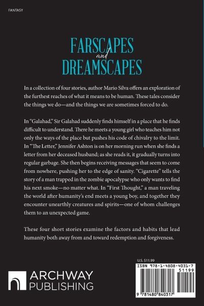 In a collection of four stories, author Mario Silva offers an exploration of the furthest reaches of what it means to be human. These tales consider the things we do-and the things we are sometimes forced to do. In "Galahad," Sir Galahad suddenly finds himself in a place that he finds difficult to understand. There he meets a young girl who teaches him not only the ways of the place but pushes his code of chivalry to the limit. In "The Letter," Jennifer Ashton is on her morning run when she finds a letter from her deceased husband; as she reads it, it gradually turns into regular garbage. She then begins receiving messages that seem to come from nowhere, pushing her to the edge of sanity. "Cigarette" tells the story of a man trapped in the zombie apocalypse who only wants to find his next smoke-no matter what. In "First Thought," a man traveling the world after humanity's end meets a young boy, and together they encounter unearthly creatures and spirits-one of whom challenges them to an unexpected game. These four short stories examine the factors and habits that lead humanity both away from and toward redemption and forgiveness.