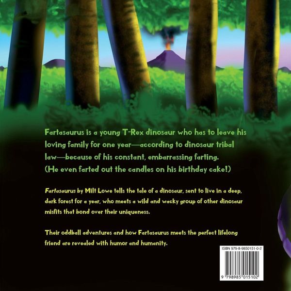 Fartasaurus is a young T-Rex dinosaur who has to leave his loving family for one year- according to dinosaur tribal law-because of his constant, embarrassing farting. (He even farted out the candles on his birthday cake!) Fartasaurus by Milt Lowe tells the tale of a dinosaur, sent to live in a deep, dark forest for a year, who meets a wild and wacky group of other dinosaur misfits that bond over their uniqueness. Their oddball adventures and how Fartasaurus meets the perfect lifelong friend are revealed with humor and humanity.