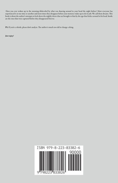 Have you ever woken up in the morning disheveled by what was dancing around in your head the night before? Most everyone has experienced it at one time or another and most times they disappear before your memory wakes up to do its job. We call them dreams. This book is about the author's attempts to lock down the nightly shows that are brought to him by the ego that frolics around in his head. Inside are the ones that were captured before they disappeared forever. PS. If you're a shrink, please don't analyze. The author is much too old to change a thing. Just enjoy!