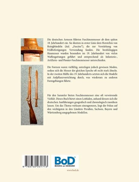 Die deutschen Armeen führten Faschinenmesser ab dem späten 18. Jahrhundert ein. Sie dienten in erster Linie dem Herstellen von Reisigbündeln (ital. Fascine), die zur Verstärkung von Feldbefestigungen Verwendung fanden. Die breitklingigen Haumesser wurden besonders im 19. Jahrhundert von vielen Waffengattungen geführt und entsprechend als Infanterie-, Artillerie- und Pionier-Faschinenmesser unterschieden. Die Formen waren vielfältig, unterlagen jedoch gewissen Moden, sodass sich die Messer der gleichen Epoche oft im gesamten deutschen Sprachraum recht stark ähneln. In der zweiten Hälfte des 19. Jahrhunderts setzten sich die Modelle mit Aufpflanzvorrichtung durch. Sie dienten zugleich als Bajonett, was wiederum zu anderen Formgebungen führte. Für den Sammler bieten Faschinenmesser eine oft verwirrende Vielfalt. Dieses Buch bietet einen Leitfaden, anhand dessen sich die deutschen Ausführungen geografisch und chronologisch zuordnen lassen. Um das Thema wirksam einzugrenzen, liegt derFokus auf den wichtigsten in den Ländern Preußen, Sachsen, Bayern und Württemberg ausgegebenen Modellen.