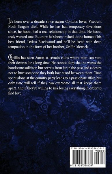 It's been over a decade since Aaron Condit's lover, Viscount Noah Seagate died. While he has had temporary diversions since, he hasn't had a real relationship in that time. He hasn't truly wanted one. But now he's been invited to the home of his best friend, Leticia Blackwood and he'll be faced with deep temptation in the form of her brother, Griffin Merrick. Griffin has seen Aaron at certain clubs where men can vent their desires for a long time. He cannot deny that he wants the handsome solicitor, but secrets from far in the past and a desire not to hurt someone they both love stand between them. Time spent alone at the country party leads to a passionate affair, but only time will tell if they can overcome all that keeps them apart. And if they're willing to risk losing everything in order to find love.
