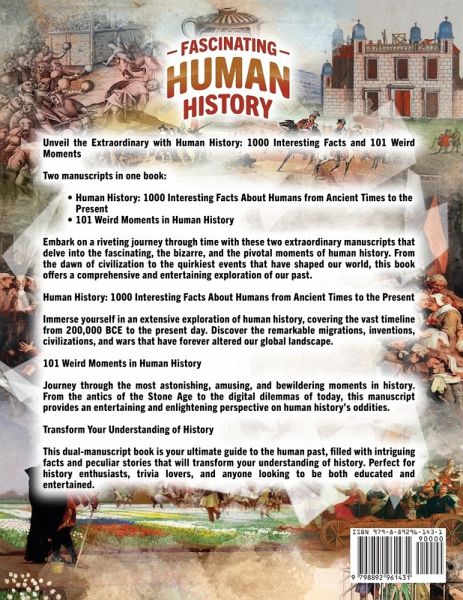 Human History: 1000 Interesting Facts About Humans from Ancient Times to the Present Immerse yourself in an extensive exploration of human history, covering the vast timeline from 200,000 BCE to the present day. Discover the remarkable migrations, inventions, civilizations, and wars that have forever altered our global landscape. In this part, you will: Explore early human migrations: Understand the movements of ancient peoples across continents in search of survival and growth. Discover revolutionary inventions: Learn about the creations that propelled humanity forward, from stone tools to the wheel. Dive into ancient cultures: Uncover the secrets of ancient civilizations such as Egypt and Mesopotamia. Follow a detailed historical timeline: Track major events including the rise of Christianity, the unification of Germany, and the Industrial Revolution. Learn about lesser-known events: Gain insights into pivotal moments not often covered in schools, like the Arab Spring. Understand modern developments: Explore contemporary issues such as the refugee crisis and the rise of social media. 101 Weird Moments in Human History Journey through the most astonishing, amusing, and bewildering moments in history. From the antics of the Stone Age to the digital dilemmas of today, this manuscript provides an entertaining and enlightening perspective on human history's oddities.