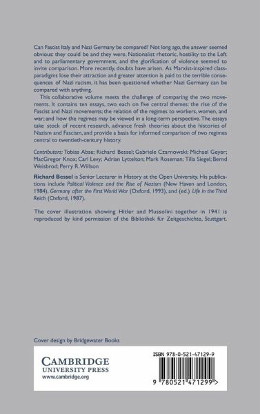 Introduction: Italy, Germany and fascism Richard Bessel; 1. The 'crisis of bourgeois society' and the origins of fascism Adrian Lyttelton; 2. The crisis of bourgeois society in interwar Germany Bernd Weisbrod; 3. Italian workers and Italian fascism Tobias Abse; 4. Whatever was the attitude of German workers? Reflections on recent interpretations Tilla Siegel; 5. Women in fascist Italy Perry R. Willson; 6. 'The value of marriage for the Volksgemeinschaft': policies towards women and marriage under National Socialism Gabriele Czarowski; 7. Expansionist zeal, fighting power, and staying power in the Italian and German dictatorships MacGregor Knox; 8. Restorative elites, German society and the Nazi pursuit of war Michael Geyer; 9. From fascism to 'post-fascists': Italian roads to modernity Carl Levy; 10. National Socialism and modernisation Mark Roseman.