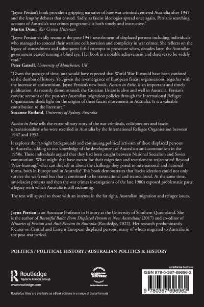 "Given the passage of time, one would have expected that World War II would have been confined to the dustbin of history. Yet, given the re-emergence of European fascist organisations, together with the increase of antisemitism, Jayne Persian's new book, Fascists in Exile, is an important and timely publication. As recently demonstrated, the Croatian Ustase is alive and well in Australia. Persian's concise account of the post-war Australian migration policies through the International Refugee Organisation sheds light on the origins of these fascist movements in Australia. It is a valuable, timely and important contribution to the literature."