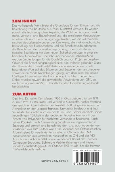 Eine Einführung und Analyse des Faser-Kunststoff-Schichtenverbunds und seiner Ausgangsstoffe. Behandelt werden weiterhin die Herstellung von Bauteilen, die Werkstoffeigenschaften und ihre Interpretation durch Modelle, die Vorausberechnung der Einzelschicht-Kennwerte mittels Mikromechanik sowie die Berechnung der Bauteilbeanspruchung.