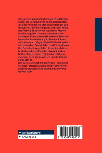 Das Buch zeigt ausführlich die vielen Möglichkeiten für die Gestaltung von textilen Halbzeugen, die über verschiedene Stadien zum fertigen Bauteil führen. Desweiteren gibt es Einblick in Kombinationsmöglichkeiten von Fasern und Matrices mit thermoplastischen und duroplastischen Polymeren. Die Autoren diskutieren die Besonderheiten der Bauweisenmöglichkeiten mit Faserverbunden und belegen die Vielfalt der Bau-weisen mit zahlreichen Bauteilbildern und Prinzipskizzen. Das Buch dient sowohl dem Studenten als Lehrbuch als auch dem Praktiker als ausführliches Nachschlagewerk und regt den Entwicklungsingenieur zu neuen Bauweisen- und Fertigungskonzepten an. Das Buch "Faserverbundbauweisen - Fasern und Matrices" derselben Autoren bildet eine hervorragende Grundlage und Ergänzung zum vorliegenden Werk. Fachgebiete: Werkstofftechnik Interessenten: Anwendung