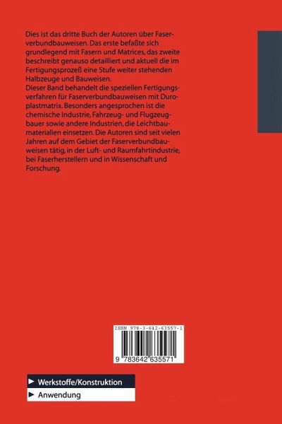 'Dies ist das dritte Buch der Autoren über Faserverbundbauweisen. Das erste befaßte sich mit den grundlegenderen Fasern und Matrices, das zweite beschreibt genauso detailliert und aktuell die im Fertigungsprozeß eine Stufe weiter stehenden Halbzeuge und Bauweisen. Dieser Band behandelt die speziellen Fertigungsverfahren für Faserverbundbauweisen mit Duroplastmatrix. Besonders angesprochen ist die chemische Industrie, Fahrzeug- und Flugzeugbauer sowie andere Industrien, die Leichtbaumaterialien einsetzen. Die Autoren sind seit vielen Jahren auf dem Gebiet der Faserverbundbauweisen tätig, in der Luft- und Raumfahrtindustrie, bei Faserherstellern und in Wissenschaft und Forschung.