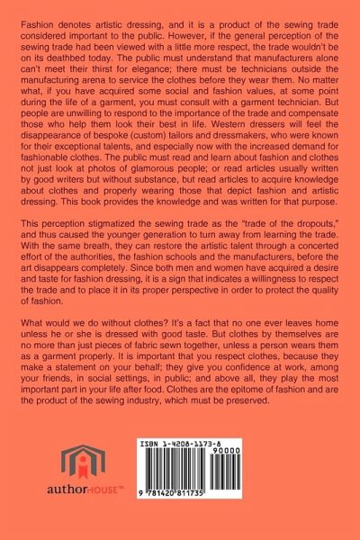 Fashion denotes artistic dressing, and it is a product of the sewing trade considered important to the public. However, if the general perception of the sewing trade had been viewed with a little more respect, the trade wouldn't be on its deathbed today. The public must understand that manufacturers alone can't meet their thirst for elegance; there must be technicians outside the manufacturing arena to service the clothes before they wear them. No matter what, if you have acquired some social and fashion values, at some point during the life of a garment, you must consult with a garment technician. But people are unwilling to respond to the importance of the trade and compensate those who help them look their best in life. Western dressers will feel the disappearance of bespoke (custom) tailors and dressmakers, who were known for their exceptional talents, and especially now with the increased demand for fashionable clothes. The public must read and learn about fashion and clothes not just look at photos of glamorous people; or read articles usually written by good writers but without substance, but read articles to acquire knowledge about clothes and properly wearing those that depict fashion and artistic dressing. This book provides the knowledge and was written for that purpose. This perception stigmatized the sewing trade as the "trade of the dropouts," and thus caused the younger generation to turn away from learning the trade. With the same breath, they can restore the artistic talent through a concerted effort of the authorities, the fashion schools and the manufacturers, before the art disappears completely. Since both men and women have acquired a desire and taste for fashion dressing, it is a sign that indicates a willingness to respect the trade and to place it in its proper perspective in order to protect the quality of fashion. What would we do without clothes? It's a fact that no one ever leaves home unless he or she is dressed with good taste.