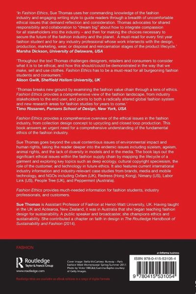 Fashion Ethics brings to light the ethical aspects of the fashion supply chain from sketch book to machinist, from marketing campaigns to trucks at the landfill site. Sue Thomas considers the total ethical landscape addressing issues such as environmentalism, child labour, animal rights, sustainability, ageism, and globalization.