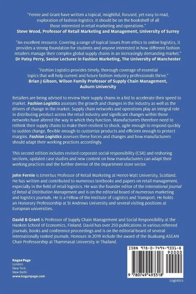 Chapter 01: Introduction to fashion logistics; Chapter 02: The changing nature of fashion retailing: Implications for logistics; Chapter 03: Offshore sourcing and outsourcing in the international fashion supply chain; Chapter 04: Corporate social responsibility (CSR) in international fashion supply chains; Chapter 05: International logistics; Chapter 06: In store consumer service; Chapter 07: Online consumer service; Chapter 08: Luxury fashion and supply chain management; Chapter 09: Sustainable fashion retailing and logistics;