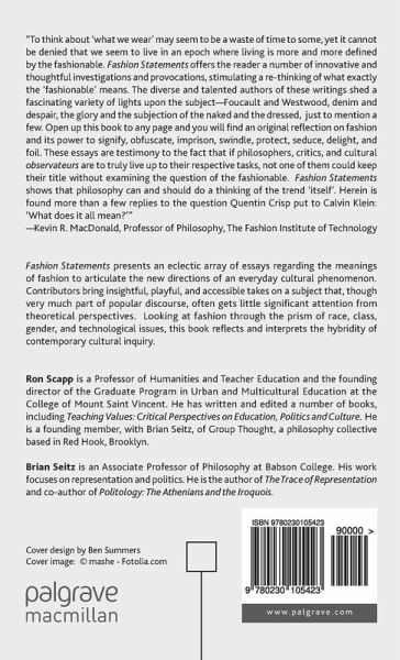 "To think about 'what we wear' may seem to be a waste of time to some, yet it cannot be denied that we seem to live in an epoch where living is more and more defined by the fashionable. Fashion Statements offers the reader a number of innovative and thoughtful investigations and provocations, stimulating a re-thinking of what exactly the 'fashionable' means. The diverse and talented authors of these writings shed a fascinating variety of lights upon the subject - Foucault and Westwood, denim and despair, the glory and the subjection of the naked and the dressed, just to mention a few. Open up this book to any page and you will find an original reflection on fashion and its power to signify, obfuscate, imprison, swindle, protect, seduce, delight, and foil. These essays are testimony to the fact that if philosophers, critics, and cultural observateurs are to truly live up to their respective tasks, not one of them could keep their title without examining the question of the fashionable. Fashion Statements shows that philosophy can and should do a thinking of the trend 'itself'. Herein is found more than a few replies to the question Quentin Crisp put to Calvin Klein: 'What does it all mean?'" - Kevin R. MacDonald, Professor of Philosophy, The Fashion Institute of Technology