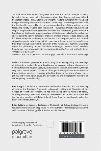 "To think about 'what we wear' may seem to be a waste of time to some, yet it cannot be denied that we seem to live in an epoch where living is more and more defined by the fashionable. Fashion Statements offers the reader a number of innovative and thoughtful investigations and provocations, stimulating a re-thinking of what exactly the 'fashionable' means. The diverse and talented authors of these writings shed a fascinating variety of lights upon the subject - Foucault and Westwood, denim and despair, the glory and the subjection of the naked and the dressed, just to mention a few. Open up this book to any page and you will find an original reflection on fashion and its power to signify, obfuscate, imprison, swindle, protect, seduce, delight, and foil. These essays are testimony to the fact that if philosophers, critics, and cultural observateurs are to truly live up to their respective tasks, not one of them could keep their title without examining the question of the fashionable. Fashion Statements shows that philosophy can and should do a thinking of the trend 'itself'. Herein is found more than a few replies to the question Quentin Crisp put to Calvin Klein: 'What does it all mean?'" - Kevin R. MacDonald, Professor of Philosophy, The Fashion Institute of Technology
