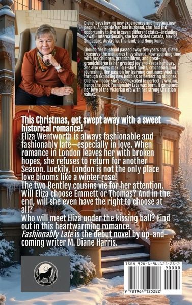 This Christmas, get swept away with a sweet historical romance! Eliza Wentworth is always fashionable and fashionably late-especially in love. When romance in London leaves her with broken hopes, she refuses to return for another Season. Luckily, London is not the only place love blooms like a winter rose! The two Bentley cousins vie for her attention. Will Eliza choose Emmett or Thomas? And in the end, will she even have the right to choose at all? Who will meet Eliza under the kissing ball? Find out in this heartwarming romance. Fashionably Late is the debut novel by up-and-coming writer M. Diane Harris. About the author: Diane loves having new experiences and meeting new people. Alongside her late husband, she had the opportunity to live in seven different states-including Hawaii! Internationally, she has visited Canada, Mexico, Singapore, Australia, Thailand, and Hong Kong. Though her husband passed away five years ago, Diane treasures the memories they shared. Now spending time with her children, grandchildren, and great-grandchildren is her greatest joy and keeps her busy. She also enjoys making T-shirt quilts, crocheting, and journaling. Her passion for learning continues whether through exploring new hobbies or perfecting old ones. One new hobby she's been excited to perfect is writing, hence the book Fashionably Late was born. It combines her love of the Victorian era with her strong Christian values.