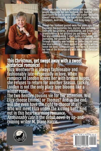 This Christmas, get swept away with a sweet historical romance! Eliza Wentworth is always fashionable and fashionably late-especially in love. When romance in London leaves her with broken hopes, she refuses to return for another Season. Luckily, London is not the only place love blooms like a winter rose! The two Bentley cousins vie for her attention. Will Eliza choose Emmett or Thomas? And in the end, will she even have the right to choose at all? Who will meet Eliza under the kissing ball? Find out in this heartwarming romance. Fashionably Late is the debut novel by up-and-coming writer M. Diane Harris. About the author: Diane loves having new experiences and meeting new people. Alongside her late husband, she had the opportunity to live in seven different states-including Hawaii! Internationally, she has visited Canada, Mexico, Singapore, Australia, Thailand, and Hong Kong. Though her husband passed away five years ago, Diane treasures the memories they shared. Now spending time with her children, grandchildren, and great-grandchildren is her greatest joy and keeps her busy. She also enjoys making T-shirt quilts, crocheting, and journaling. Her passion for learning continues whether through exploring new hobbies or perfecting old ones. One new hobby she's been excited to perfect is writing, hence the book Fashionably Late was born. It combines her love of the Victorian era with her strong Christian values.