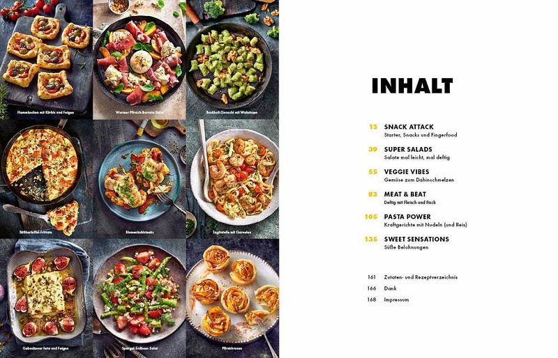 Von knackigen Salaten und würzigen Bowls über blitzschnelle Pasta-Gerichte bis zu unwiderstehlichen Desserts: Dieses Kochbuch steckt voller Rezepte für jede Gelegenheit. Besonders genial sind Achims kreative Kombinationen: Mediterrane Zutaten wie Feige, Feta und Parmaschinken treffen auf knusprigen Blätterteig, werden mit Käse überbacken und verwandeln sich in spektakulär einfache, leckere Kreationen.