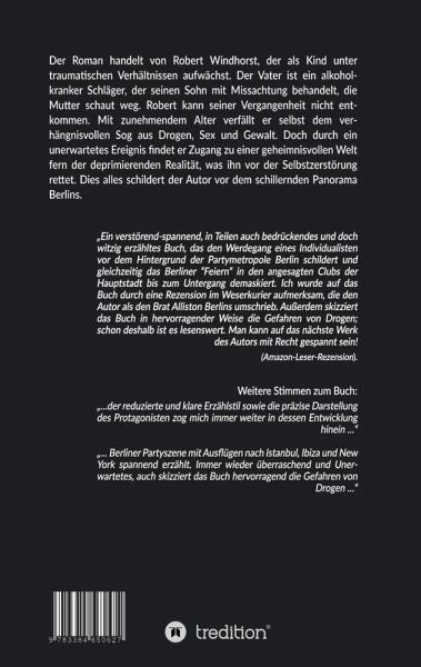 Der Roman handelt von Robert Windhorst, der als Kind unter traumatischen Verhältnissen aufwächst. Der Vater ist ein alkoholkranker Schläger, der seinen Sohn mit Missachtung behandelt, die Mutter schaut weg. Robert kann seiner Vergangenheit nicht entkommen. Mit zunehmendem Alter verfällt er selbst dem verhängnisvollen Sog aus Drogen, Sex und Gewalt. Doch durch ein unerwartetes Ereignis findet er Zugang zu einer geheimnisvollen Welt fern der deprimierenden Realität, was ihn vor der Selbstzerstörung rettet. Dies alles schildert der Autor vor dem schillernden Panorama Berlins.