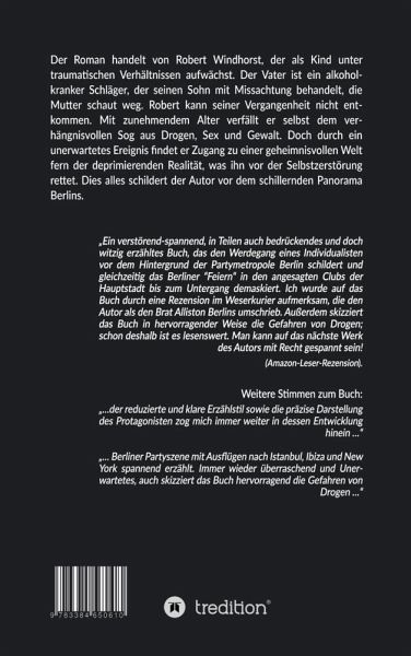 Der Roman handelt von Robert Windhorst, der als Kind unter traumatischen Verhältnissen aufwächst. Der Vater ist ein alkoholkranker Schläger, der seinen Sohn mit Missachtung behandelt, die Mutter schaut weg. Robert kann seiner Vergangenheit nicht entkommen. Mit zunehmendem Alter verfällt er selbst dem verhängnisvollen Sog aus Drogen, Sex und Gewalt. Doch durch ein unerwartetes Ereignis findet er Zugang zu einer geheimnisvollen Welt fern der deprimierenden Realität, was ihn vor der Selbstzerstörung rettet. Dies alles schildert der Autor vor dem schillernden Panorama Berlins.