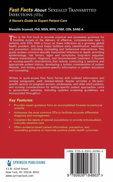 This is the first book to provide practical and accessible guidance for frontline nurses in the delivery of effective, compassionate care to patients with STIs. With a focus on these infections as a growing global-health problem, this book helps facilitate early identification, treatment, and prevention, including counseling and behavioral interventions. This guide reviews common sexually transmitted diseases in depth, providing epidemiology, risk factors, signs and symptoms, long-term sequelae, disease transmission, diagnosis, and recommended treatment. It focuses on nursing-specific interventions that include understanding a sensitive and appropriate patient history, interpreting a holistic consideration of patient lifestyle, and linking population-specific patient education and counseling. Written in quick-access Fast Facts format with bulleted information and concise paragraphs, each disease-related chapter provides a lifespan-specific section on pregnant women, adolescents and older adult patients, and nursing considerations for setting specific patient approaches. Links to government websites, such as updated screening guidelines, are incorporated throughout.Key Features:Provides expert guidance from an accomplished forensic nurse/nurse midwife Addresses the most common STIs to facilitate accurate differential diagnosis and management li>Considers to needs of special populations to provide individualized, culturally sensitive care Offers evidence-based patient information, prevention, and counseling guidance to maximize positive public health outcomes
