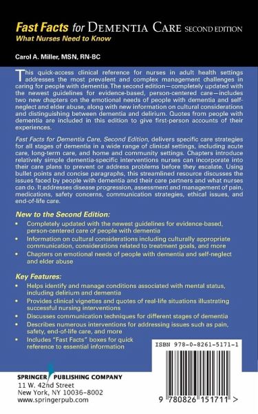 This quick-access clinical reference for nurses in adult health settings addresses the most prevalent and complex management challenges in caring for people with dementia. The second edition-completely updated with the newest guidelines for evidence-based, person-centered care-includes two new chapters on the Emotional Needs of People with Dementia and Self-Neglect and Elder Abuse, along with new information on cultural considerations and distinguishing between dementia and delirium. Quotes from people with dementia are included in this edition to give first-person accounts of their experiences. Fast Facts for Dementia Care, Second Edition delivers specific care strategies for all stages of dementia in a wide range of clinical settings, including acute care, long-term care, and home and community settings. Chapters introduce relatively simple dementia-specific interventions nurses can incorporate into their care plans to prevent or address problems before they escalate. Using bullet points and concise paragraphs, this streamlined resource discusses the issues faced by people with dementia and their care partners and what nurses can do. It addresses disease progression, assessment and management of pain, medications, safety concerns, communication strategies, ethical issues, and end-of-life care.New to the Second Edition:Completely updated with the newest guidelines for evidence-based, person-centered care of people with dementia New information of cultural considerations including culturally appropriate communication, considerations related to treatment goals, and more Chapters on Emotional Needs of People with Dementia and Self-Neglect and Elder Abuse Key Features:Helps identify and manage conditions associated with mental status, including delirium and dementia Provides clinical vignettes and quotes of real-life situations illustrating successful nursing interventions Discusses communication techniques for different stages of dementia Describes numerous interventions for addressing issues such as pain, safety, end-of-life care, and more Includes "Fast Facts" boxes for quick reference to essential information