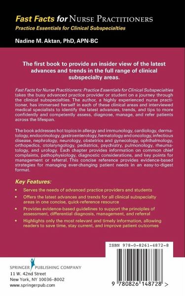 Note to Readers: Publisher does not guarantee quality or access to any included digital components if book is purchased through a third-party seller. The first book to provide an insider view of the latest advances and trends in the full range of clinical subspecialty areas. Fast Facts for Nurse Practitioners: Practice Essentials for Clinical Subspecialties takes the busy advanced practice provider or student on a journey through the clinical subspecialties. The author, a highly experienced nurse practitioner, has immersed herself in each of these clinical areas and interviewed medical specialists to identify the latest advances, trends, and tips to more confidently and competently assess, diagnose, manage, and refer patients across the lifespan. The book addresses hot topics in allergy and immunology, cardiology, dermatology, endocrinology, gastroenterology, hematology and oncology, infectious disease, nephrology, neurology, obstetrics and gynecology, ophthalmology, orthopedics, otolaryngology, pediatrics, psychiatry, pulmonology, rheumatology, and urology. Each chapter provides information on common chief complaints, pathophysiology, diagnostic considerations, and key points for management or referral. This concise reference provides evidence-based strategies for managing ever-changing patient needs in an easy-to-digest format. Key Features: Serves the needs of advanced practice providers and students Offers the latest advances and trends for all clinical subspecialty areas in one concise, quick-reference resource Provides evidence-based guidelines to support the principles of assessment, differential diagnosis, management, and referral Highlights only the most relevant and timely information, allowing readers to save time, stay current, and improve patient outcomes