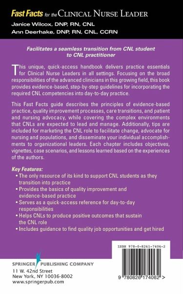 Facilitates a seamless transition from CNL student to CNL practitioner This unique, quick-access handbook delivers practice essentials for Clinical Nurse Leaders in all settings. Focusing on the broad responsibilities of the advanced clinicians in this growing field, this book provides evidence-based, step-by-step guidelines for incorporating the required CNL competencies into day-to-day practice. This Fast Facts guide describes the principles of evidence-based practice, quality improvement processes, care transitions, and patient and nursing advocacy, while covering the complex environments that CNLs are expected to lead and manage. Additionally, tips are included for marketing the CNL role to facilitate change, advocate for Nursing and Populations, and disseminate your individual accomplishments to organizational leaders. Each chapter includes objectives, vignettes, case scenarios, and lessons learned based on the experiences of the authors.Key Features:The only resource of its kind to supports CNL students as they transition into practice Provides the basics of quality improvement and evidence-based practice Serves as a quick-access reference for day-to-day responsibilities Helps CNLs to produce positive outcomes that sustain the CNL role Includes guidance to find quality job opportunities and get hired