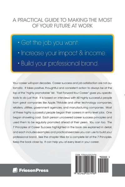 Your career will span decades. Career success and job satisfaction are not automatic. It takes positive, thoughtful and consistent action to always be at the top of the "highly promotable" list. "Fast Forward Your Career" gives you specific tools to do just that. It is based on interviews with 60 highly successful people from great companies like Apple, T-Mobile and other technology companies, retailers, utilities, government agencies, and manufacturing companies. Most of these highly successful people began their careers in entry level jobs. One began shoveling coal. Each person uncovered career success principles and used them to be regularly promoted ahead of their peers. You can too. The 7 Principles of Career Success highlighted in the book are explained in detail, and each includes examples and practical exercises you can use to build your professional brand. See the chapter titles for a complete list of the 7 Principles. Keep the book close by. It can help you at every level in your career.