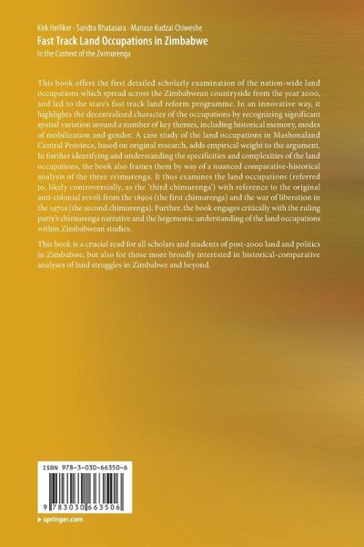 This book offers the first detailed scholarly examination of the nation-wide land occupations which spread across the Zimbabwean countryside from the year 2000, and led to the state's fast track land reform programme. In an innovative way, it highlights the decentralized character of the occupations by recognizing significant spatial variation around a number of key themes, including historical memory, modes of mobilization and gender. A case study of the land occupations in Mashonaland Central Province, based on original research, adds empirical weight to the argument. In further identifying and understanding the specificities and complexities of the land occupations, the book also frames them by way of a nuanced comparative-historical analysis of the three zvimurenga. It thus examines the land occupations (referred to, likely controversially, as the 'third chimurenga') with reference to the original anti-colonial revolt from the 1890s (the first chimurenga) and the war of liberation in the 1970s (the second chimurenga). Further, the book engages critically with the ruling party's chimurenga narrative and the hegemonic understanding of the land occupations within Zimbabwean studies.