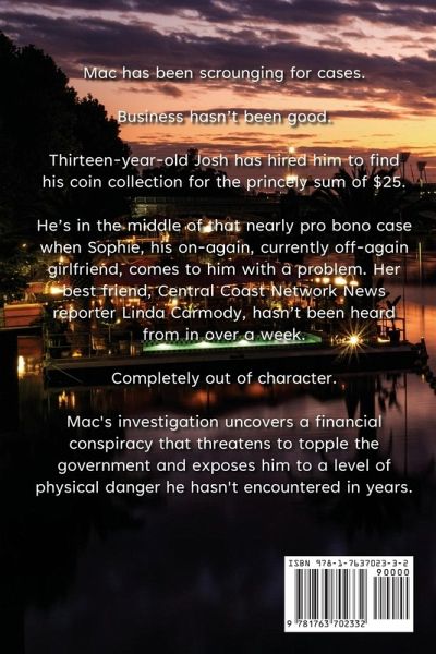 Mac has been scrounging for cases. Business hasn't been good. Thirteen-year-old Josh has hired him to find his coin collection for the princely sum of $25. He's in the middle of that nearly pro bono case when Sophie, his on-again, currently off-again girlfriend, comes to him with a problem. Her best friend, Central Coast Network News reporter Linda Carmody, hasn't been heard from in over a week. Completely out of character. Mac's investigation uncovers a financial conspiracy that threatens to topple the government and exposes him to a level of physical danger he hasn't encountered in years.