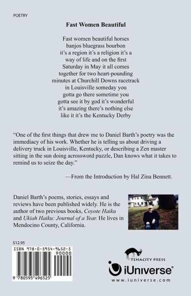 Fast Women Beautiful Fast women beautiful horses banjos bluegrass bourbon it's a region it's a religion it's a way of life and on the first Saturday in May it all comes together for two heart-pounding minutes at Churchill Downs race- track in Louisville someday you gotta go there sometime you gotta see it by god it's wonderful it's amazing there's nothing else like it it's the Kentucky Derby "One of the first things that drew me to Daniel Barth's poetry was the immediacy of his work, that is, how his imagery and subject matter pulled my focus into everyday life, made me pay attention to the elusive present. Whether he is telling us about driving a delivery truck in Louisville, Kentucky, for the Coca-Cola Bottling Company, or describing a Zen master sitting in the sun doing a crossword puzzle, Dan knows what it takes to remind us to seize the day."-From the Introduction by Hal Zina Bennett