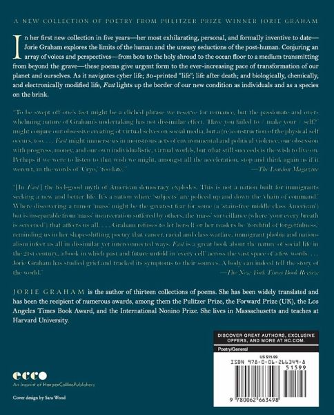 In her first new collection in five years-her most exhilarating, personal, and formally inventive to date-Jorie Graham explores the limits of the human and the uneasy seductions of the post-human. Conjuring an array of voices and perspectives-from bots to the holy shroud, to the ocean floor, to a medium transmitting from beyond the grave-these poems give urgent form to the ever-increasing pace of transformation of our planet and ourselves. As it navigates cyber life; 3D printed "life"; life after death; and biologically, chemically, and electronically modified life, Fast lights up the border of our new condition as individuals and as a species on the brink.