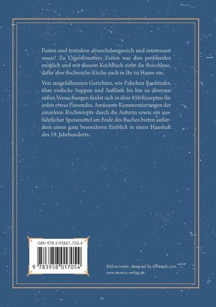 Fasten und trotzdem abwechslungsreich und interessant essen? Zu Urgroßmutters Zeiten war dies problemlos möglich und mit diesem Kochbuch zieht die fleischlose, dafür aber fischreiche Küche auch in Ihr zu Hause ein. Von ausgefalleneren Gerichten, wie Falschen Beefsteaks, über einfache Suppen und Aufläufe bis hin zu diversen süßen Versuchungen findet sich in über 850 Rezepten für jeden etwas Passendes. Amüsante Kommentierungen der einzelnen Kochrezepte durch die Autorin sowie ein ausführlicher Speisezettel am Ende des Buches bieten außerdem einen ganz besonderen Einblick in einen Haushalt des 19. Jahrhunderts.