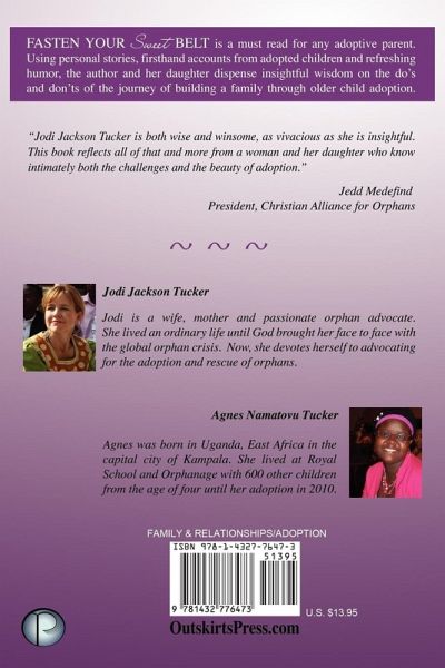 FASTEN YOUR SWEET BELT: 10 Things You Need to Know About Older Child Adoption Fasten Your Sweet Belt is a must read for any adoptive parent. Using personal stories, firsthand accounts from adoptive children and refreshing humor, the author and her 15 year-old adopted daughter dispense insightful wisdom on the do's and don'ts of the journey of building a family through older child adoption. Jodi Jackson Tucker is both wise and winsome, as vivacious as she is insightful. This book reflects all of that and more from a woman and her daughter who know intimately both the challenges and the beauty of adoption. Jedd Medefind President, Christian Alliance for Orphans