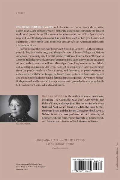 Conjuring numerous voices and characters across oceans and centuries, Faster Than Light explores widely disparate experiences through the lens of traditional poetic forms. This volume contains a selection of Marilyn Nelson's new and uncollected poems as well as work from each of her lyric histories of eighteenth-, nineteenth-, and twentieth-century African American individuals and communities. Poems include the stories of historical figures like Emmett Till, the fourteen-year-old boy lynched in 1955, and the inhabitants of Seneca Village, an African American community razed in 1857 for the creation of Central Park. "Bivouac in a Storm" tells the story of a group of young soldiers, later known as the Tuskegee Airmen, as they trained near Biloxi, Mississippi, "marching in summer heat / thick as blackstrap molasses, under trees / haunted by whippings." Later pieces range from the poet's travels in Africa, Europe, and Polynesia, to poems written in collaboration with Father Jacques de Foiard Brown, a former Benedictine monk and the subject of Nelson's playful fictional fantasy sequence, "Adventure-Monk!" Both personal and historical, these poems remain grounded in everyday details but reach toward spiritual and moral truths.