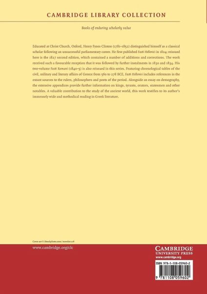 Educated at Christ Church, Oxford, Henry Fynes Clinton (1781-1852) distinguished himself as a classical scholar following an unsuccessful parliamentary career. He first published Fasti Hellenici in 1824; reissued here is the 1827 second edition, which contained a number of additions and corrections. The work received such a favourable reception that it was followed by further instalments in 1830 and 1834. His two-volume Fasti Romani (1840-5) is also reissued in this series. Featuring chronological tables of the civil, military and literary affairs of Greece from 560 to 278 BCE, Fasti Hellenici includes references in the extant sources to the rulers, philosophers and poets of the period. Alongside an essay on demography, the extensive appendices provide further information on kings, tyrants, orators, statesmen and other notables. A valuable contribution to the study of the ancient world, this work testifies to its author's immensely wide and methodical reading in Greek literature.