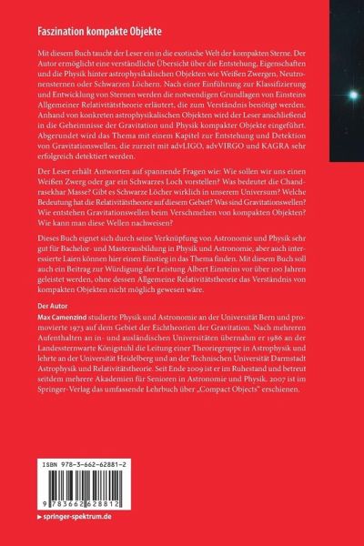 Mit diesem Buch taucht der Leser ein in die exotische Welt der kompakten Sterne. Der Autor ermöglicht eine verständliche Übersicht über die Entstehung, Eigenschaften und die Physik hinter astrophysikalischen Objekten wie Weiße Zwergen, Neutronensternen oder Schwarzen Löchern. Nach einer Einführung zur Klassifizierung und Entwicklung von Sternen werden die notwendigen Grundlagen von Einsteins Allgemeiner Relativitätstheorie erläutert, die zum Verständnis benötigt werden. Anhand von konkreten astrophysikalischen Objekten wird der Leser anschließend in die Geheimnisse der Gravitation und Physik kompakter Objekte eingeführt. Abgerundet wird das Thema mit einem Kapitel zur Entstehung und Detektion von Gravitationswellen, die zurzeit mit advLIGO, advVIRGO und KAGRA sehr erfolgreich detektiert werden.
