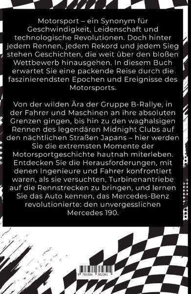 Entdecken Sie die fesselnden Geschichten hinter den größten Momenten des Motorsports! Dieses Buch nimmt Sie mit auf eine Reise durch die Welt der Geschwindigkeit, Innovation und des unbändigen Nervenkitzels, die den Motorsport zu einem globalen Phänomen gemacht haben. Ob technologische Durchbrüche, atemberaubende Rennen oder die mutigen Fahrer, die sich immer wieder in Gefahr begaben - hier finden Sie die besten Geschichten auf vier Rädern.Was Sie in diesem Buch erwartet:-Gruppe B Rallye - Die gefährlichste Ära im Motorsport: Erleben Sie die brutale Geschwindigkeit und die legendären Fahrzeuge dieser waghalsigen Zeit, als Technik und Mensch an ihre Grenzen stießen.-Midnight Club - Illegale Straßenrennen in Japan: Tauchen Sie in die mysteriöse Welt der legendären Straßengang ein, die auf Tokios Autobahnen Geschwindigkeitsrekorde aufstellte.-Mercedes-Benz 190 - Der Baby-Benz, der die Marke revolutionierte: Entdecken Sie, wie ein Auto nicht nur den deutschen Autohersteller veränderte, sondern auch die Welt des Motorsports beeinflusste.-Turbinen in Sportwagen - Der gescheiterte Traum der Ingenieure: Lesen Sie über die ambitionierten Versuche, Gasturbinen in Rennwagen zu integrieren und warum diese Technik letztlich scheiterte.Dieses Buch richtet sich an:-Motorsport-Enthusiasten, die die technischen und historischen Meilensteine des Rennsports entdecken möchten-Leser, die fesselnde und wahre Geschichten voller Adrenalin und Innovation lieben-Fans von Automobilgeschichte und Ingenieurskunst, die die Entwicklung des Motorsports verstehen wollenVerpassen Sie nicht die Gelegenheit, die spannendsten und gefährlichsten Geschichten des Motorsports zu entdecken - ein Muss für alle Liebhaber der Geschwindigkeit und Technik!