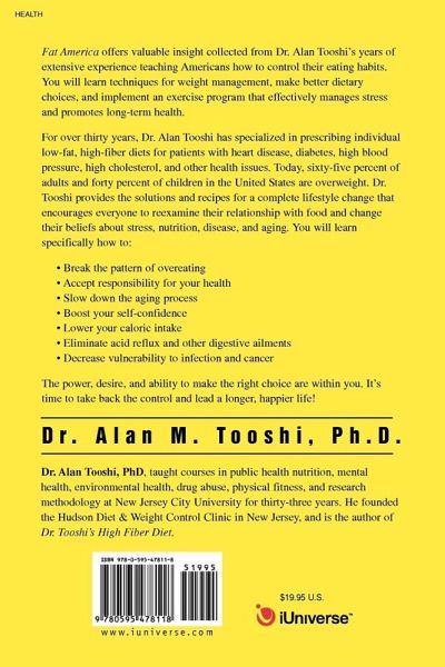 Fat America offers valuable insight collected from Dr. Alan Tooshi's years of extensive experience teaching Americans how to control their eating habits. You will learn techniques for weight management, make better dietary choices, and implement an exercise program that effectively manages stress and promotes long-term health. For over thirty years, Dr. Alan Tooshi has specialized in prescribing individual low-fat, high-fiber diets for patients with heart disease, diabetes, high blood pressure, high cholesterol, and other health issues. Today, sixty-five percent of adults and forty percent of children in the United States are overweight. Dr. Tooshi provides the solutions and recipes for a complete lifestyle change that encourages everyone to reexamine their relationship with food and change their beliefs about stress, nutrition, disease, and aging. You will learn specifically how to: Break the pattern of overeating Accept responsibility for your health Slow down the aging process Boost your self-confidence Lower your caloric intake Eliminate acid reflux and other digestive ailments Decrease vulnerability to infection and cancer The power, desire, and ability to make the right choice are within you. It's time to take back the control and lead a longer, happier life!