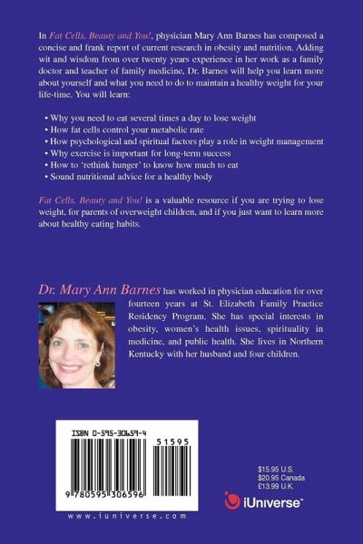 In Fat Cells, Beauty and You!, physician Mary Ann Barnes has composed a concise and frank report of current research in obesity and nutrition. Adding wit and wisdom from over twenty years experience in her work as a family doctor and teacher of family medicine, Dr. Barnes will help you learn more about yourself and what you need to do to maintain a healthy weight for your life-time. You will learn: Why you need to eat several times a day to lose weight How fat cells control your metabolic rate How pyschological and spiritual factors play a role in weight management Why exercise is important for long-term success How to 'rethink hunger' to know how much to eat Sound nutritional advice for a healthy body Fat Cells, Beauty and You! is a valuable resource if you are trying to lose weight, for parents of overweight children, and if you just want to learn more about healthy eating habits.