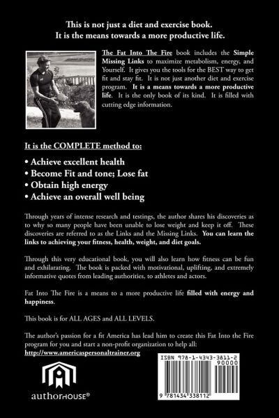 The Fat Into The Fire book includes the Simple Missing Links to maximize metabolism, energy, and Yourself. It gives you the tools for the BEST way to get fit and stay fit. It is not just another diet and exercise program. It is a means towards a more productive life. It is the only book of its kind. It is filled with cutting edge information. It is the COMPLETE method to: -Achieve excellent health -Become Fit and tone; Lose fat -Obtain high energy -Achieve an overall well being -Reduce and Control Stress Through years of intense research and testings, the author shares his discoveries as to why so many people have been unable to lose weight and keep it off. These discoveries are referred to as the Links and the Missing Links. You can learn the links to achieving your fitness, health, weight, and diet goals. Through this very educational book, you will also learn how fitness can be fun and exhilarating. The book is packed with motivational, uplifting, and extremely informative quotes from leading authorities, to athletes and actors. Fat Into The Fire is a means to a more productive life filled with energy and happiness. This book is for ALL AGES and ALL LEVELS. The author's passion for a fit America has lead him to create this Fat Into the Fire program for you and start a non-profit organization to help all: http://www.americaspersonaltrainer.org