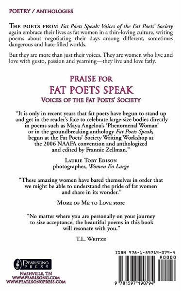 The poets from Fat Poets Speak: Voices of the Fat Poets' Society again embrace their lives as fat women in a thin-loving culture and write poems about negotiating their days among different, sometimes dangerous and hate-filled worlds. But they are more than just their voices. They are women who live and love with gusto, passion and yearning -- they live and love fatly. Fat Poets Speak 2 takes you on a journey through the lives of these deeply angry, loving, creative poets. Laugh, cry, commiserate and celebrate as the poets guide you through highs and lows, sadness and joy, grim defiance and determination and stunning pinnacles of loving and understanding. Especially lush and sensuous poems are starred for the benefit of readers. Fat Poets Speak 2 features the poems of Kathy Barron, Anne S. Kaplan, Lesleigh Owen, Eileen Rosensteel, Mary Ray Worley, and Frannie Zellman, with new voices Durette Hauser, Deb Lemire, Dr. Deah Schwartz and M.M. Stein.