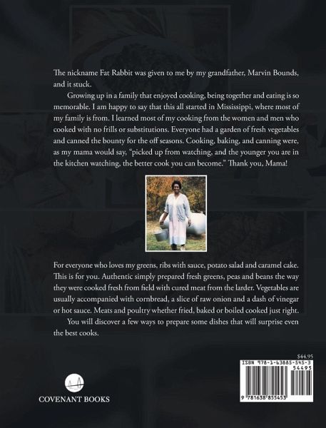 The nickname Fat Rabbit was given to me by my grandfather, Marvin Bounds, and it stuck. Growing up in a family that enjoyed cooking, being together and eating is so memorable. I am happy to say that this all started in Mississippi, where most of my family is from. I learned most of my cooking from the women and men who cooked with no frills or substitutions. Everyone had a garden of fresh vegetables and canned the bounty for the off seasons. Cooking, baking, and canning were, as my mama would say, "picked up from watching, and the younger you are in the kitchen watching, the better cook you can become." Thank you, Mama! For everyone who loves my greens, ribs with sauce, potato salad and caramel cake. This is for you. Authentic simply prepared fresh greens, peas and beans the way they were cooked fresh from field with cured meat from the larder. Vegetables are usually accompanied with cornbread, a slice of raw onion and a dash of vinegar or hot sauce. Meats and poultry whether fried, baked or boiled cooked just right. You will discover a few ways to prepare some dishes that will surprise even the best cooks.