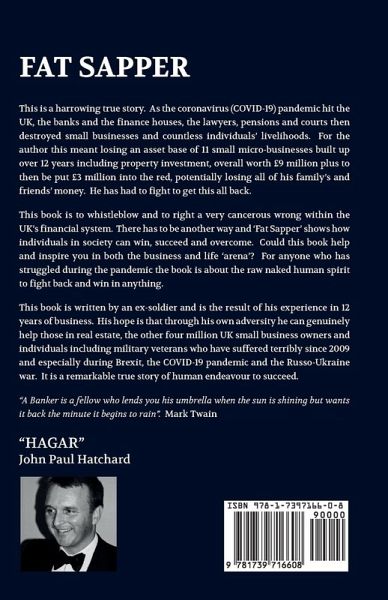 This is a harrowing true story. As the coronavirus (COVID-19) pandemic hit the UK, the banks and the finance houses, the lawyers, pensions and courts then destroyed small businesses and countless individuals' livelihoods. For the author this meant losing an asset base of 11 small micro-businesses built up over 12 years including property investThis is a harrowing true story. As the coronavirus (COVID-19) pandemic hit the UK, the banks and the finance houses, the lawyers, pensions and courts then destroyed small businesses and countless individuals' livelihoods. For the author this meant losing an asset base of 11 small micro-businesses built up over 12 years including property investment, overall worth £9 million plus to then be put £3 million into the red, potentially losing all of his family's and friends' money. He has had to fight to get this all back. This book is to whistleblow and to right a very cancerous wrong within the UK's financial system. There has to be another way and 'Fat Sapper' shows how individuals in society can win, succeed and overcome. Could this book help and inspire you in both the business and life 'arena'? For anyone who has struggled during the pandemic the book is about the raw naked human spirit to fight back and win in anything. This book is written by an ex-soldier and is the result of his experience in 12 years of business. His hope is that through his own adversity he can genuinely help those in real estate, the other four million UK small business owners and individuals including military veterans who have suffered terribly since 2009 and especially during Brexit and the COVID-19 pandemic. It is a remarkable true story of human endeavour to succeed. ment, overall worth £9 million plus to then be put £3 million into the red, potentially losing all of his family's and friends' money. He has had to fight to get this all back. This book is to whistleblow and to right a very cancerous wrong within the UK's financial system. There has to be another way and 'Fat Sapper' shows how individuals in society can win, succeed and overcome. Could this book help and inspire you in both the business and life 'arena'? For anyone who has struggled during the pandemic the book is about the raw naked human spirit to fight back and win in anything. This book is written by an ex-soldier and is the result of his experience in 12 years of business. His hope is that through his own adversity he can genuinely help those in real estate, the other four million UK small business owners and individuals including military veterans who have suffered terribly since 2009 and especially during Brexit and the COVID-19 pandemic. It is a remarkable true story of human endeavour to succeed.
