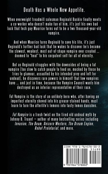 Now a new TV series on SYFY: Reginald The Vampire! Death Has a Brand New Appetite... When overweight treadmill salesman Reginald Baskin finally meets a co-worker who doesn't make fun of him, it's his own bad luck that tech guy Maurice turns out to be a two thousand-year-old vampire. And when Maurice turns Reginald to save his life, it's just Reginald's further bad luck that he wakes to discover he's become the slowest, weakest, most out-of-shape vampire ever created ... doomed to "heal" to his corpulent self for all of eternity. But as Reginald struggles with the downsides of being a fat vampire (too slow to catch people to feed on, mocked by those he tries to glamour, assaulted by his intended prey and left for undead), he discovers rare powers in himself that few vampires have ... and just in time, because the Vampire Council wants him destroyed as an inferior representative of their race.