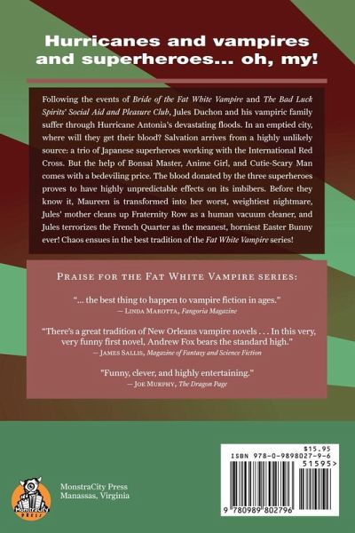 Hurricanes and vampires and superheroes... oh, my! Following the events of Bride of the Fat White Vampire and The Bad Luck Spirits' Social Aid and Pleasure Club, Jules Duchon and his vampiric family suffer through Hurricane Antonia's devastating floods. In an emptied city, where will they get their blood? Salvation arrives from a highly unlikely source: a trio of Japanese superheroes working with the International Red Cross. But the help of Bonsai Master, Anime Girl, and Cutie-Scary Man comes with a bedeviling price. The blood donated by the three superheroes proves to have highly unpredictable effects on its imbibers. Before they know it, Maureen is transformed into her worst, weightiest nightmare, Jules' mother cleans up Fraternity Row as a human vacuum cleaner, and Jules terrorizes the French Quarter as the meanest, horniest Easter Bunny ever! Chaos ensues in the best tradition of the Fat White Vampire series! Praise for the Fat White Vampire series: "... the best thing to happen to vampire fiction in ages." --Linda Marotta, Fangoria Magazine "There's a great tradition of New Orleans vampire novels . . . In this very, very funny first novel, Andrew Fox bears the standard high." -James Sallis, Magazine of Fantasy and Science Fiction "Funny, clever, and highly entertaining." --Joe Murphy, The Dragon Page